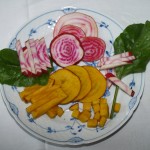 We make a mixture of carrots, parsnips and perhaps Hamburg root parsley, along with radicchio and yellow beets. The mixture is fried in a wok with a little olive oil and balsamic vinegar, which is applied with a baster, while frying, along with a little acacia honey,
