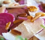 - Sprinkle with the roasted pine kernels, and finish with grated parmesan – suitable strips are achieved with a potato peeler.