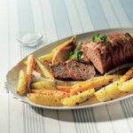 Stir the minced meat and shape it into a loaf. Wrap it in cured ham and bake for 35 minutes. at 200° Celcius. Cut root vegetables into quarters and toss them in the oil, garlic, herbs, salt and pepper. Bake them in the oven with the meat loaf for 30 minutes.